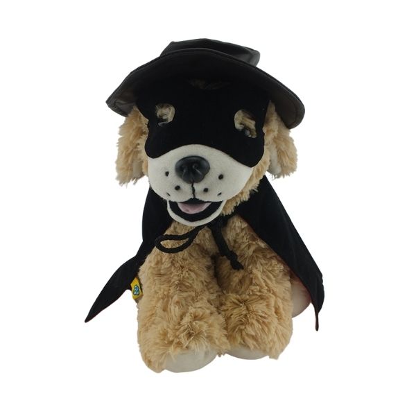 What better way to say I love you than to dress up a special bear in this love bandit outfit. It has a black wide brim hat, a black cape with red lining and a black mask.