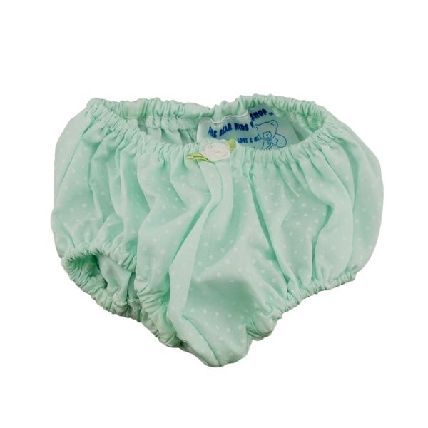 Pale green panties with white spots that are decorated with a cute little white rose on the front.