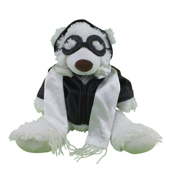 A dark brown leather look jacket with white fur trim collar, a matching hat, a set of goggles, plus a white satin scarf to finish off the old world pilot look. Every budding bear or animal pilot will love to wear this very cool outfit.
