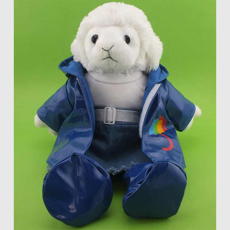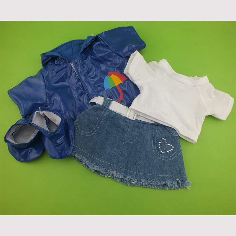 Lambie in a White T-Shirt, Denim Skirt and Blue Raincoat completed with Blue Boots - snap up some real savings here.